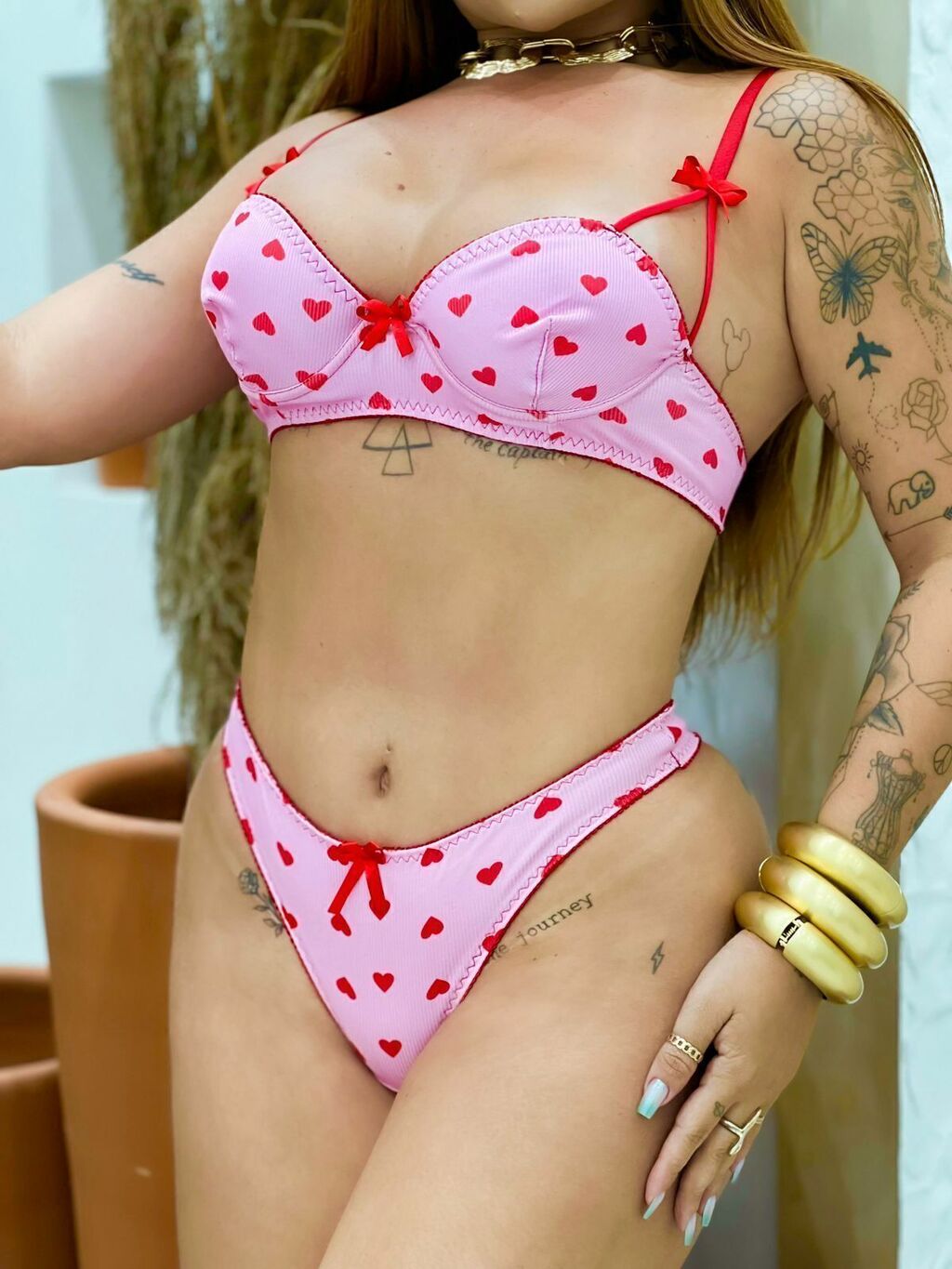 Rico em detalhes, o conjunto conta com regulagens em formato de coração, um charme especial que traz um ar romântico e delicado, além de valorizar ainda mais o visual. A estrutura com aro proporciona sustentação ideal, realçando naturalmente o busto.